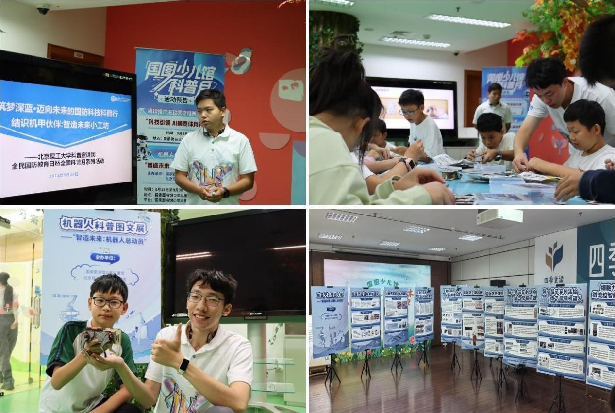 2025年9月20日上午,科普宣讲团结合九三阅兵出现的智能无人系统装备,在国家图书馆面向青少年们开展“结识机甲伙伴:智造未来小工坊”机器人专题科普讲述,并指导参加的中小学生动手体验机器人设计制作,提升青少年们科学素养。此前,由suncitygroup太阳新城兵器智能系教师代表提供的“制造未来:机器人总动员”图文展正在国家图书馆展出。