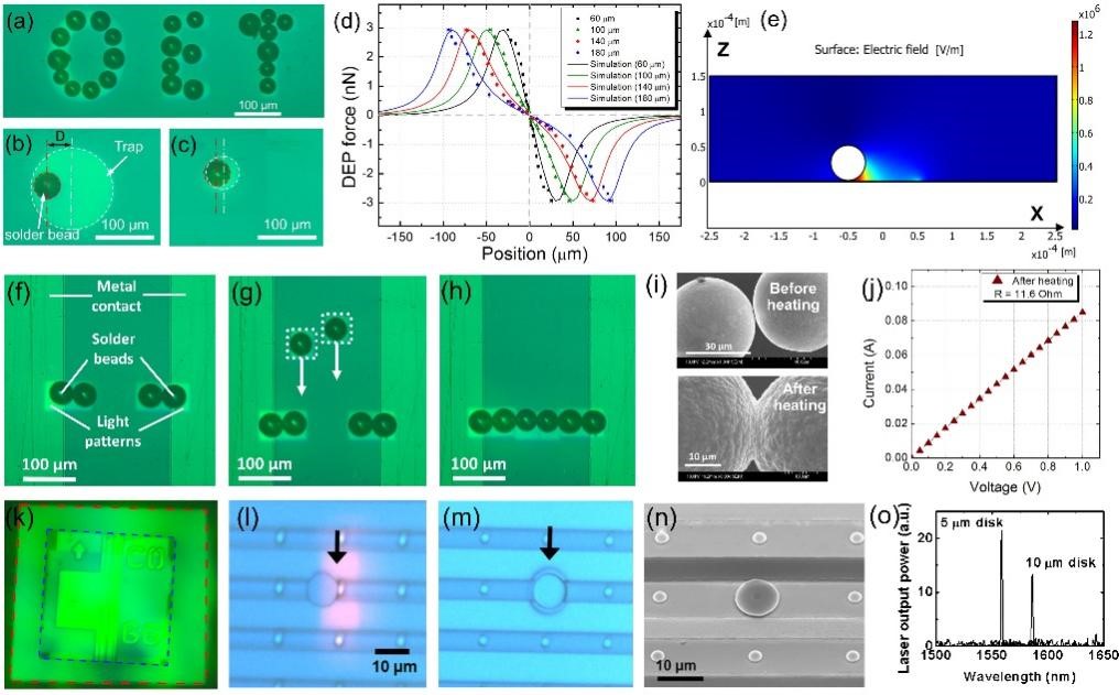 光电镊系统常用于微米以及纳米尺度物体的操作和组装。该技术已被用于各种纳米材料,包括且不限于半导体和金属纳米线、碳纳米管、石墨烯纳米片、导电纳米颗粒以及金属离子。图3所示即为使用光电镊系统操纵和装配各种纳米尺度的物体。同时,光电镊还被用于操控数微米到几百微米量级的各种微尺度物体,包括介电/金属微粒、油/水滴、气泡等。通过光电镊组装微型电子和光子元器件也是光电镊技术的一个重要应用。图4中展示了应用光电镊技术组装金属球及半导体激光器的多种应用,实验结果显示光电镊组装技术对这些器件的工作性能没有影响。